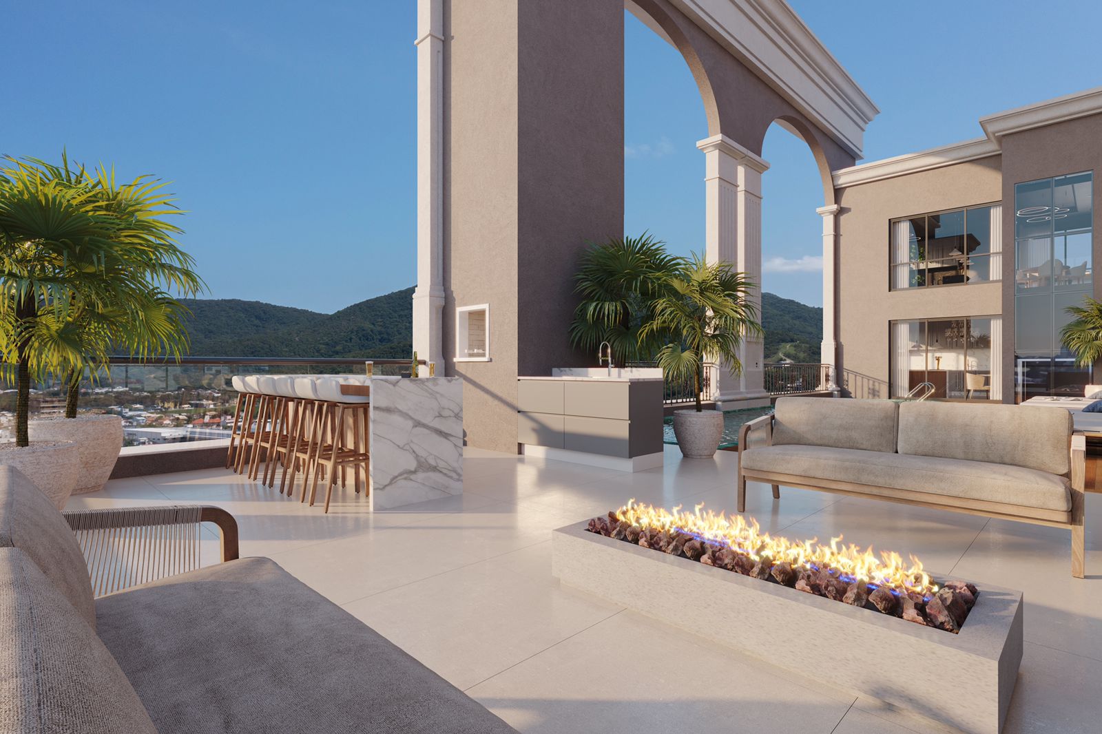 Somando os dois pavimentos, a área terá 651,36 m² e incluirá 18 opções de lazer como piscina com borda infinita, deck, fire place, bar, espaço zen, salão de festas, espaço fitness, sauna, espaço mulher, brinquedoteca, espaço games, sala de jogos e outros. Por ficarem no rooftop, vários dos ambientes são emoldurados pelas paisagens de Porto Belo.