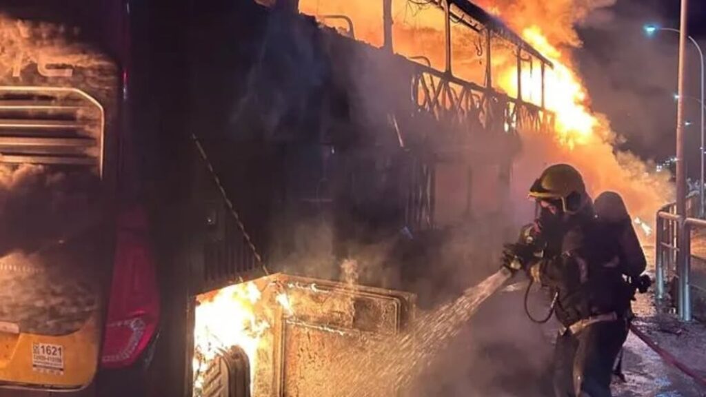 Ônibus com 45 passageiros pega fogo na BR-101 em Garuva.