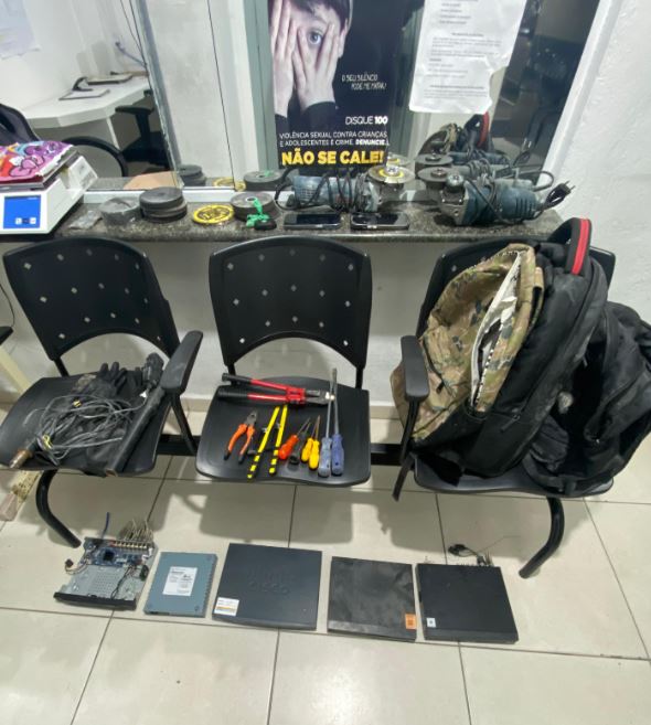 Os guardas se deslocaram até o estabelecimento, onde constataram os danos: porta arrombada, gavetas dos caixas abertas, cofre violado e cabos dos DVRs cortados. Apesar das buscas nas imediações, os outros dois suspeitos não foram localizados.