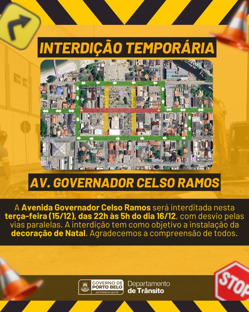O Governo de Porto Belo, por meio do Departamento de Trânsito, informa que a Avenida Governador Celso Ramos será temporariamente interditada nesta segunda-feira, dia 15 de dezembro, no período das 22h até às 5h da manhã de terça-feira, dia 16.
