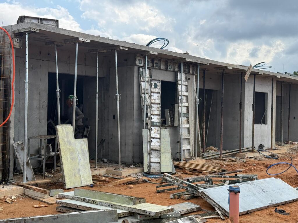 Parte das unidades já está com a estrutura erguida. Cada casa terá 52 metros quadrados, com dois quartos, sala, cozinha, banheiro e acessibilidade, priorizando funcionalidade e qualidade de vida.